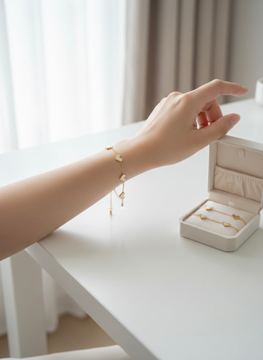 This bracelet features heart-shaped elements in a refined marble tone, evoking the smooth elegance of ancient sculpture. Each heart feels sculpted rather than adorned, creating a piece that is understated yet deeply expressive.
